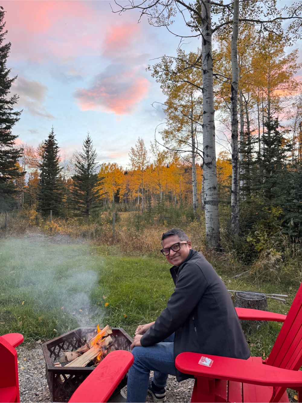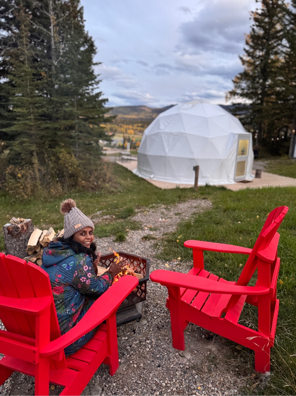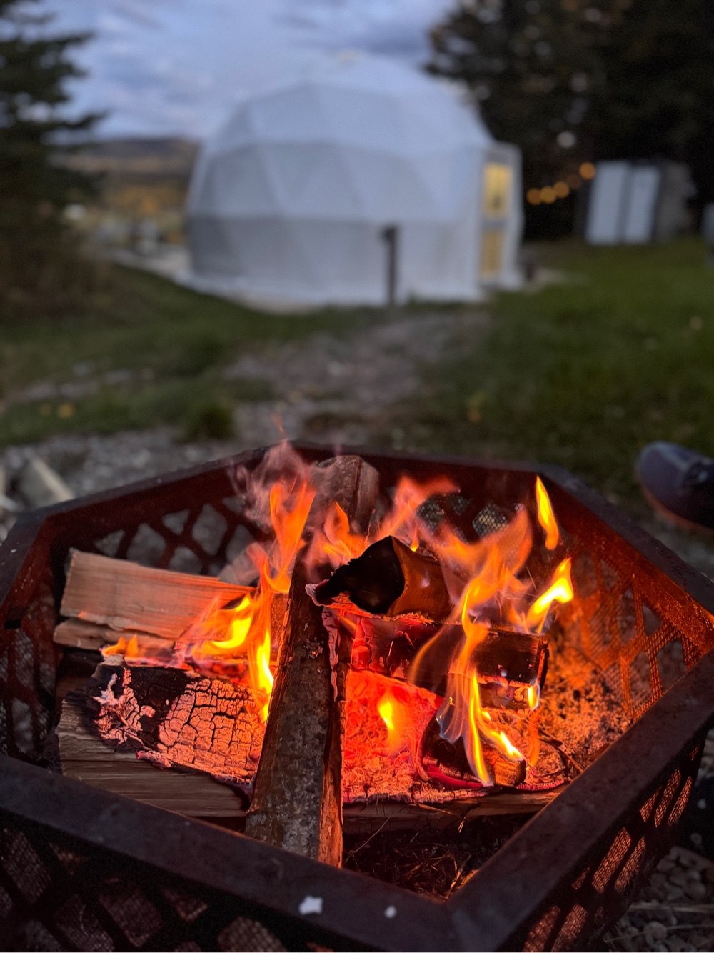 After dinner, we returned to our dome, lit up the fire pit, and spent a couple of hours just sitting under the stars, soaking in the warmth and the crackle of the fire. The weather was perfect — cool enough to enjoy the flames, with the smell of wood smoke lingering in the air. Eventually, with that cozy scent clinging to our clothes and hair, we drifted off to sleep — another magical day in the Canadian Rockies beautifully wrapped up.