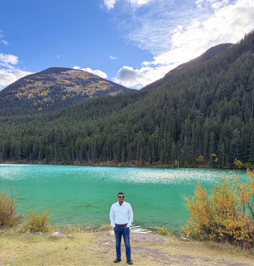 After getting ready, we set out toward Jasper for breakfast. On the way, we came across a stunning green lake that instantly caught our attention. Unlike the other turquoise-blue lakes we’d been seeing throughout the Rockies, this one shimmered in deep shades of emerald and jade, almost glowing in the morning light. It was so unique and mesmerizing that we had to stop for a while just to take it all in.